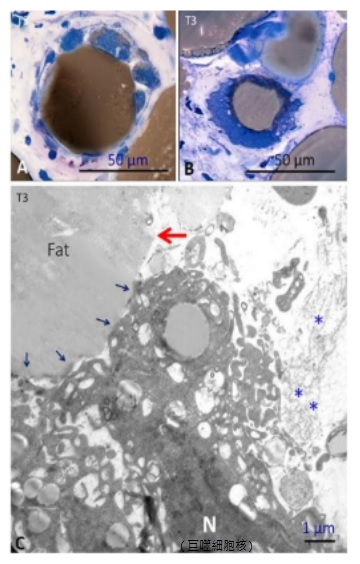 B圖 : 較小的脂肪細胞完全被多個單核細胞融合形成合體巨噬細胞。