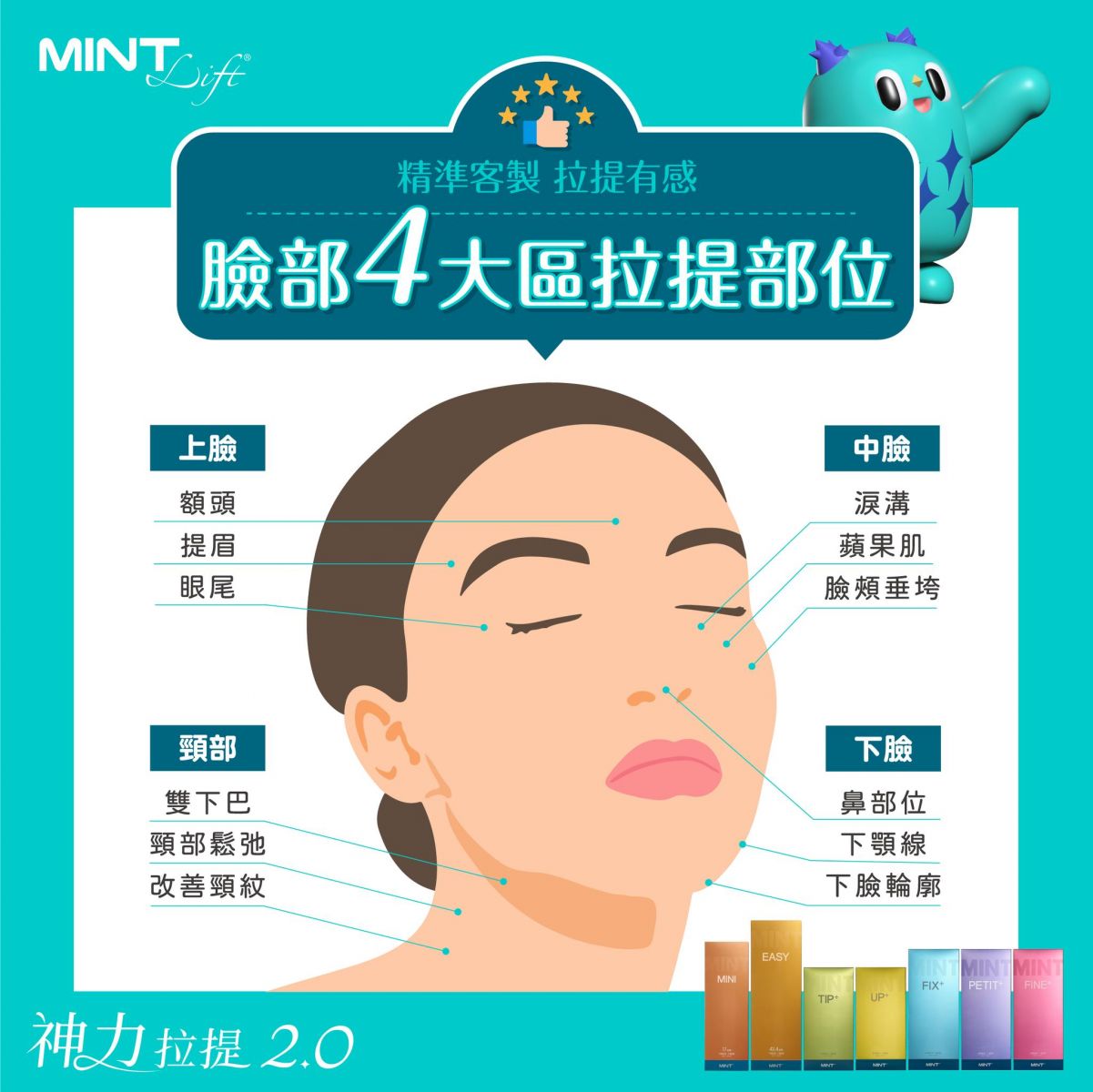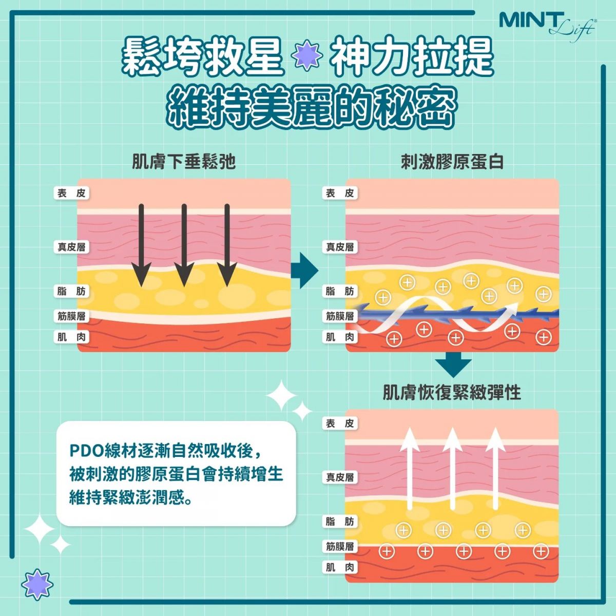 MINT LIFT使用可被人體吸收的PDO(聚對二甲基羥已酮),利用微創技術將拉提線埋在髮際線內,傷口小且不明顯,並透過特殊設計的3D立體倒鉤均勻施力在皮下組織,並刺激膠原蛋白。