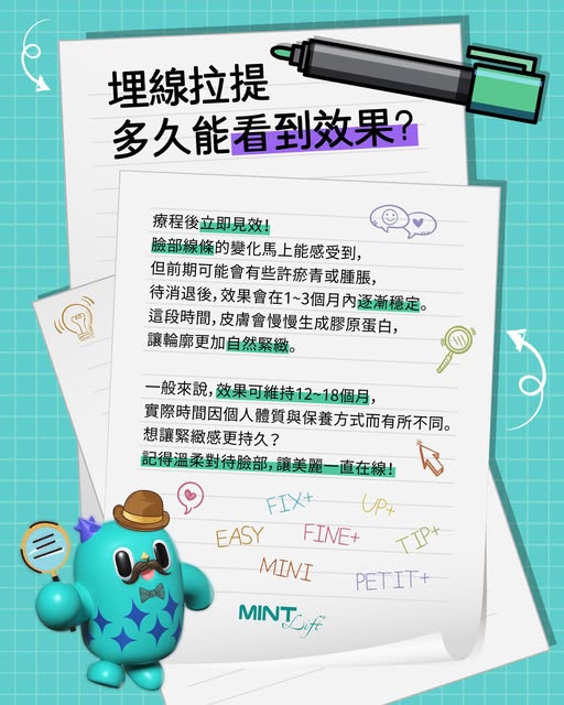 約六個月後,MINT線材將逐漸被人體吸收,而增加的膠原蛋白則將原本鬆弛下垂的部位自然拉提,添增澎潤感,達到更持久的效果!