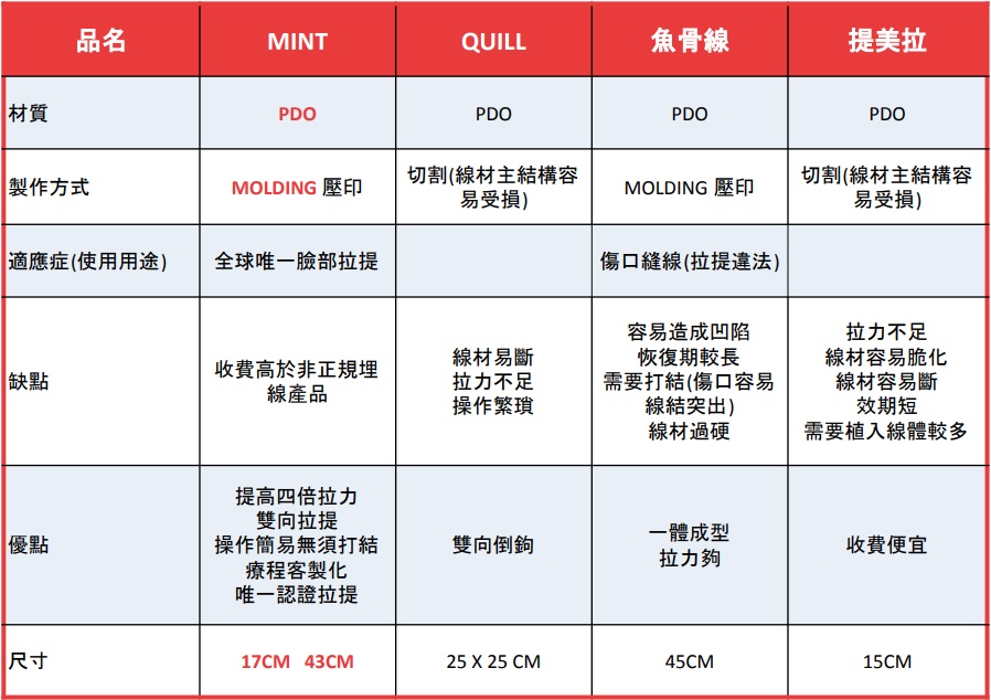 MINT LIFT 神力拉提(韓士秘特拉提線)與其他線材的比較: