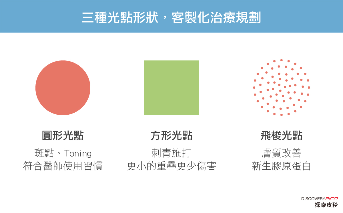 探索皮秒配有多支探頭,彩虹探頭是探索皮秒雷射的一大優勢,醫師可根據客人的症狀、治療面積、深度去做選擇圓形、方形及聚焦3種不同的探頭形狀,其中圓形光點專門用於治療斑點,針對肌膚上不同的問題、不同斑點型態選配適合的探頭,光點大小更精準治療。便能一次解決所有問題,消費者不必為了提亮膚質、縮小毛孔、除斑而多跑好幾趟,省時省力。