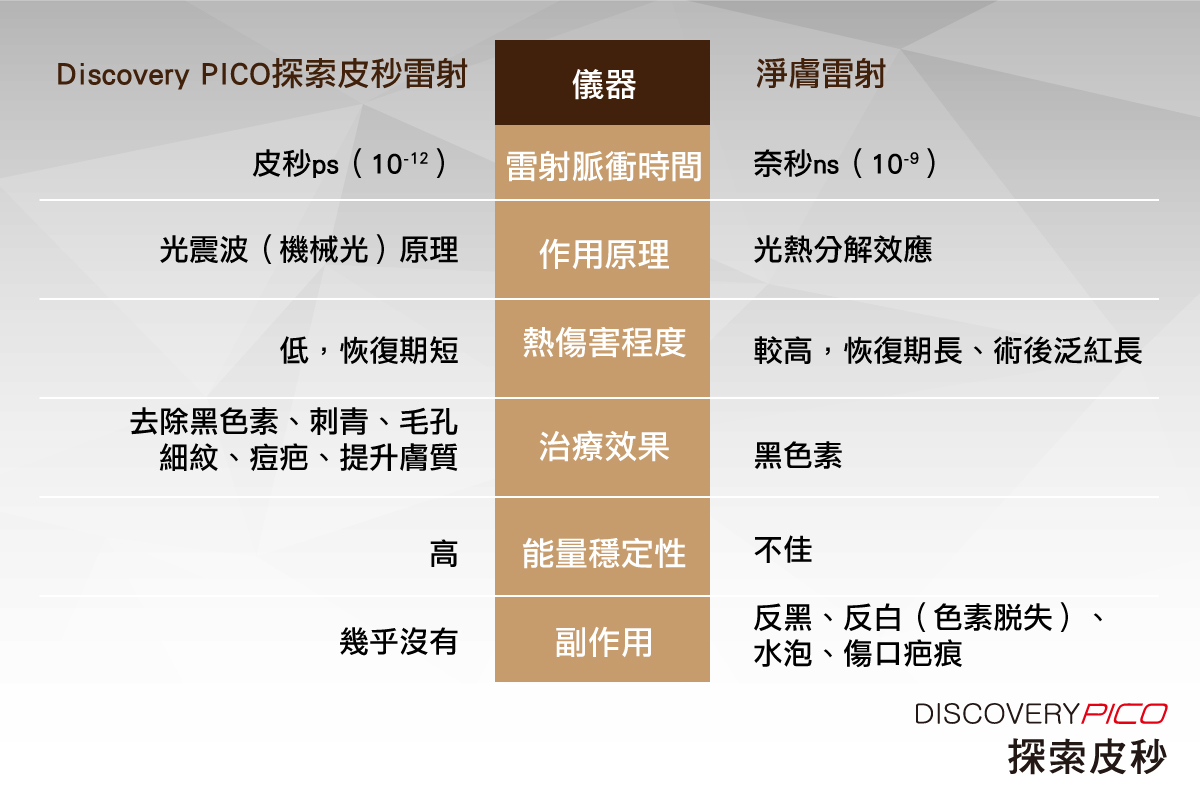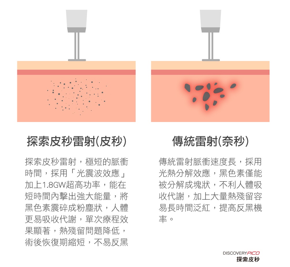 探索皮秒雷射之所以比前一代的奈秒雷射(或稱淨膚雷射)更不容易反黑或反黑時間更短,就是因為從奈秒進化到皮秒,一來縮短了1000倍雷射接觸皮膚的時間,二來皮秒雷射是機器震波而非熱能,這個瓶頸的突破,就是它對醫美科技的貢獻。