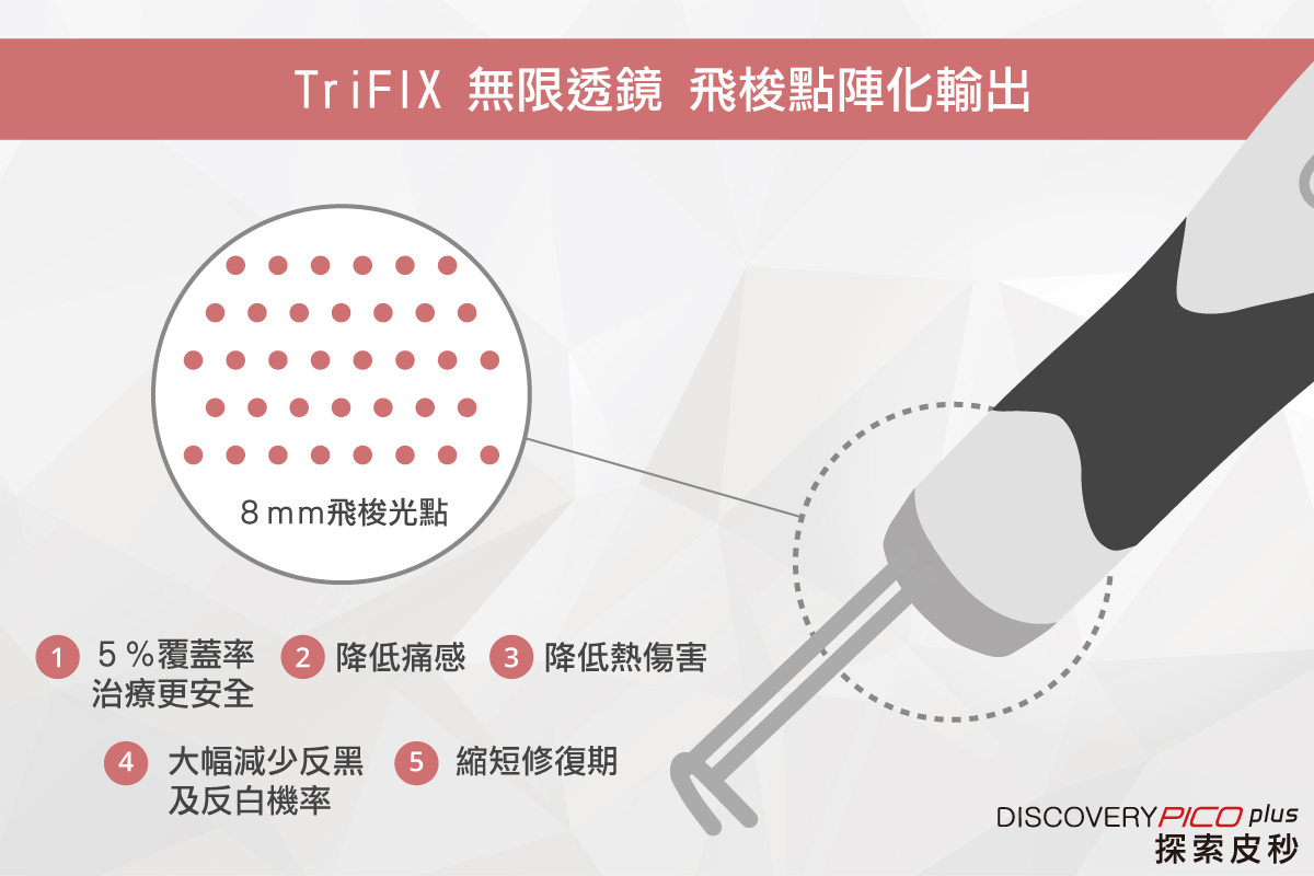 彩虹探頭中,探索皮秒升級版特別搭載了專利TriFIX無限透鏡(寶石飛梭手握把),大幅降低傳統紅寶石雷射所造成的熱傷害,還能將能量 24 倍集中輸出,大大提升擊碎黑色素效果,也不易產生反黑或反白的副作用,全臉深淺斑點一次獲得改善。