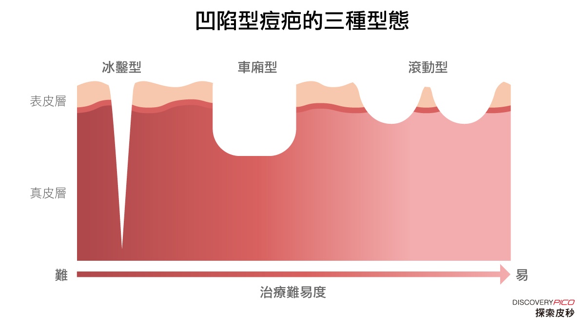 冰鑿型痘疤、車廂型痘疤、滾動型痘疤的型態呈現