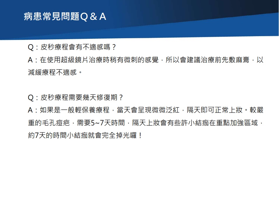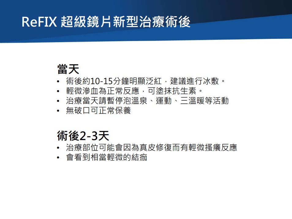 ►ReFIX超級鏡片 改善凹疤或縮小毛孔療程後,治療部位會有些微紅腫,依據不同適應症以及個人體質差異,約莫1-4小時後會退去。若有輕微灼熱現象可加強冰敷降低不適感。