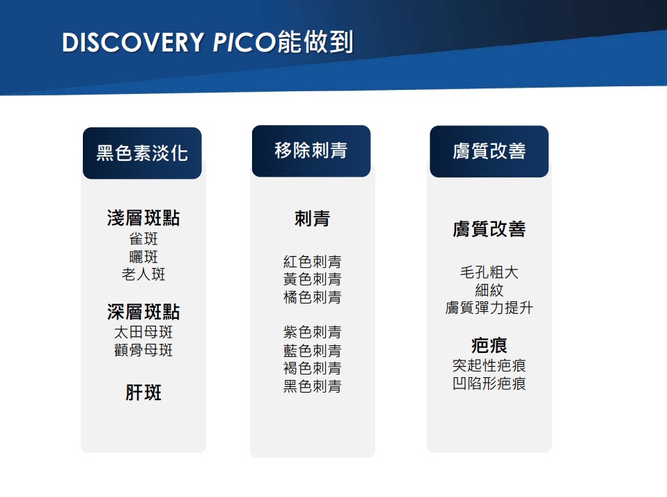 →2.利用皮秒所產生的小空泡,啟動肌膚新生,重新激活膠原蛋白,改善腦人凹凸疤痕。經臨床醫師回饋,術後產生紅腫及反黑副作用約<1%。