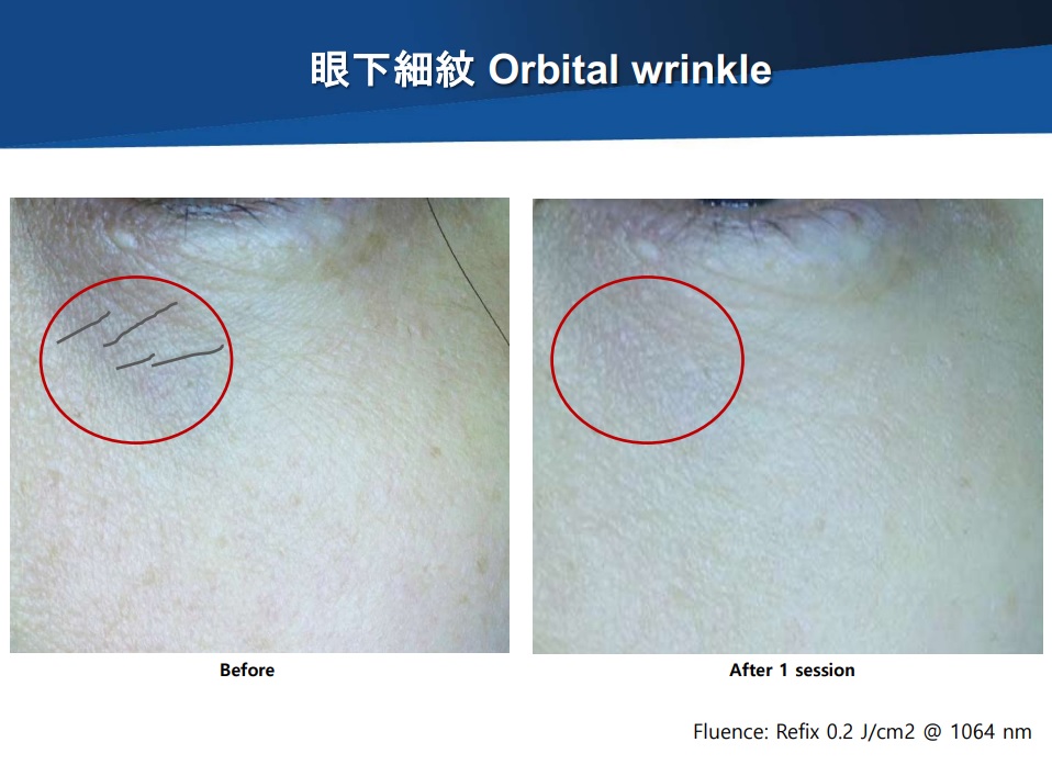 傳統飛梭雷射在治療眼下細紋時,較容易出現術後反黑的問題。經過探索皮秒一次治療後,不僅大幅減少術後反黑情形,修復期快,效果也十分明顯。