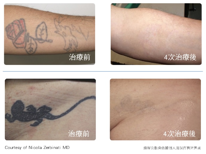 皮秒在治療黑色素的效能本來就很好,且雙波皮秒有著1064nm與532nm二種波長,多色刺青涵蓋範圍廣,所以應用在清除單色(多色)刺青上的表現,也是優等生呦!
