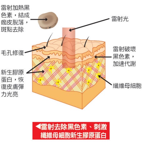 含有黑色素的部位倍雷射光照射後, 會立即結痂. 經過數日後隨著痂皮掉落而去除淺斑.