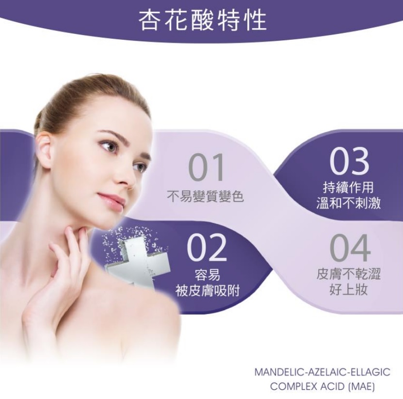 杏花酸除了保有杏仁酸原有特性外,並添加杜鵑花酸及鞣花酸的抗氧化、去角質及淡斑美白的效用。