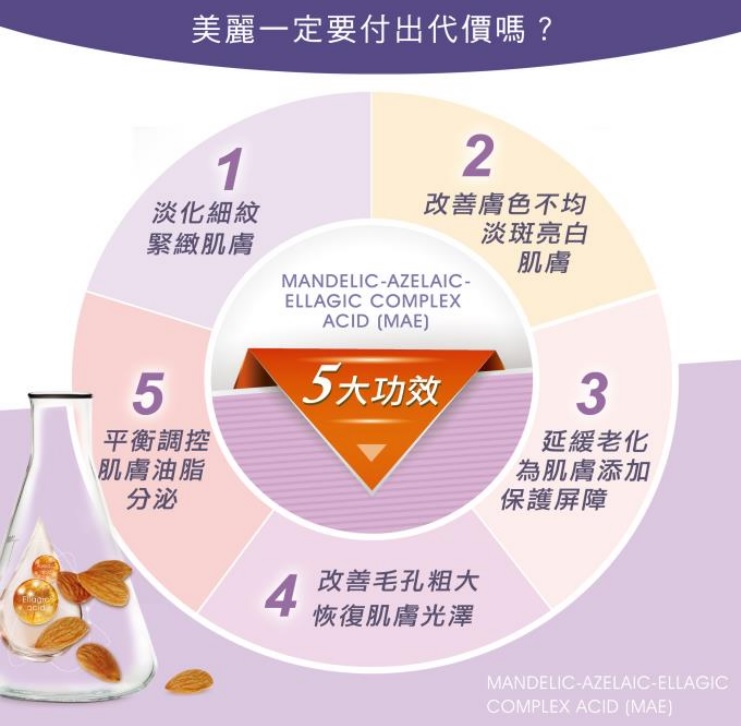 如果不要!您將有更好的選擇!杏花酸以 NLC 技術將杏仁酸、杜鵑花酸及鞣花酸合成最新一代複合式果酸。