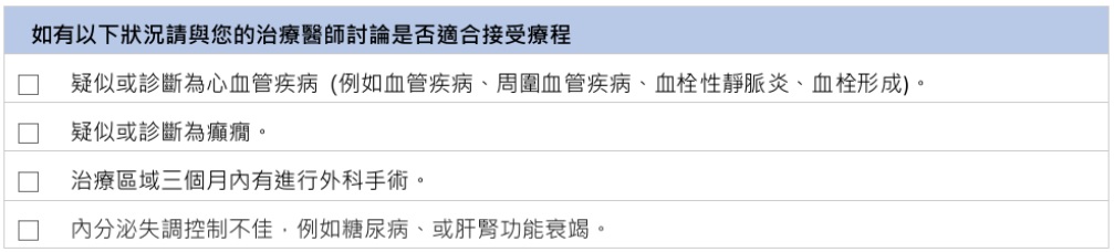 治療區域有癒合不良或未癒合的傷口、永久性植入物、任何類型癌症病史。