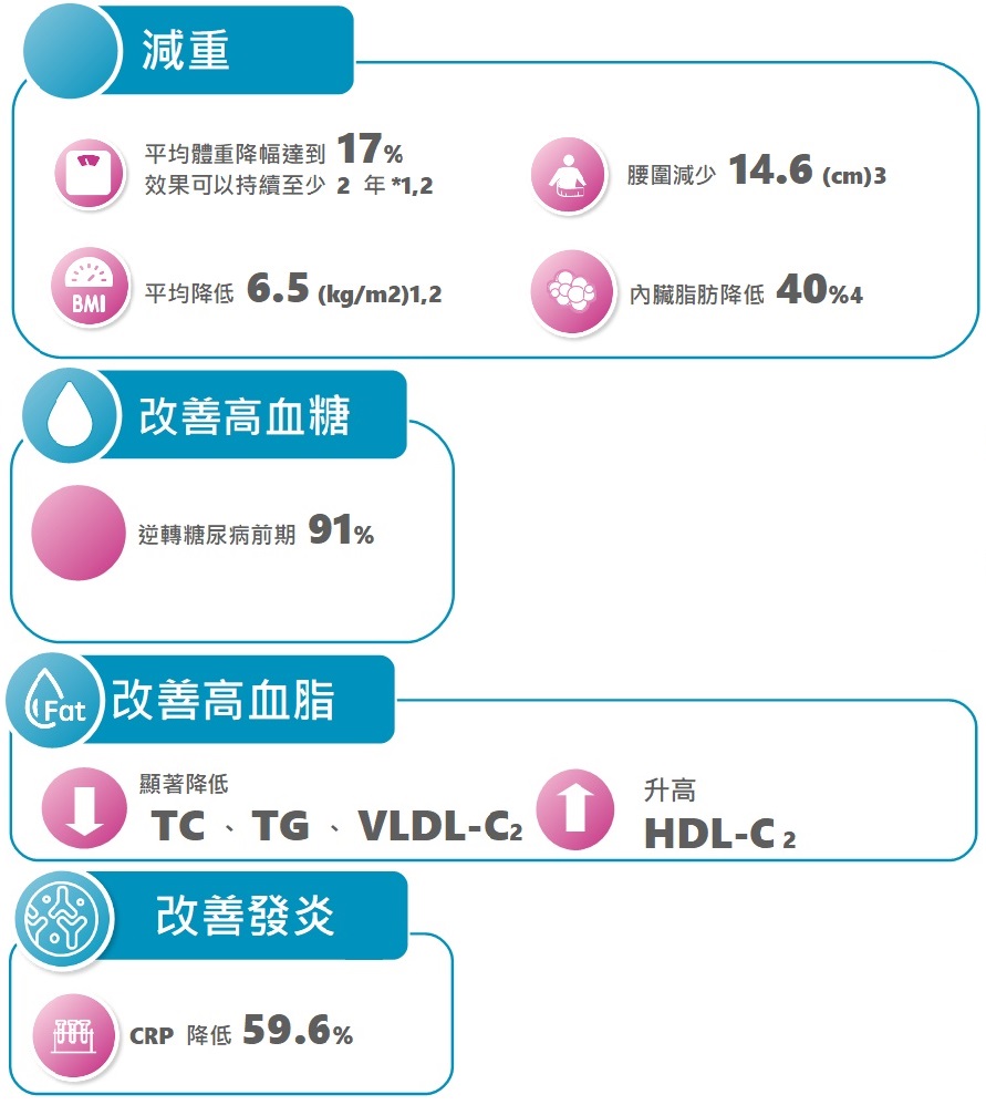 3.用於具有心血管疾病且身體質量指數 (BMI) ≥27 kg/m2 的成人病人,降低發生重大心血管不良事件 (心血管疾病死亡、非致命心肌梗塞、非致命中風) 的風險。