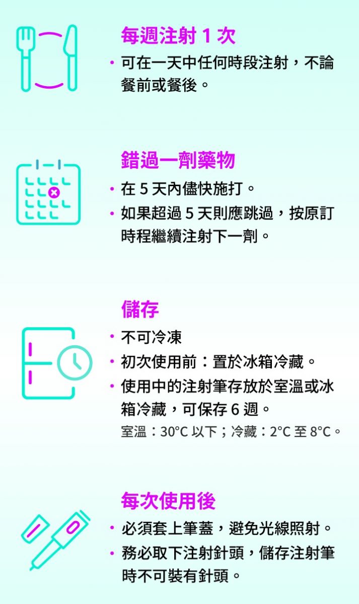 A:錯過一劑藥物,應在 5 天內儘快施打,超過 5 天則應跳過,依原訂時程繼續注射下一劑。