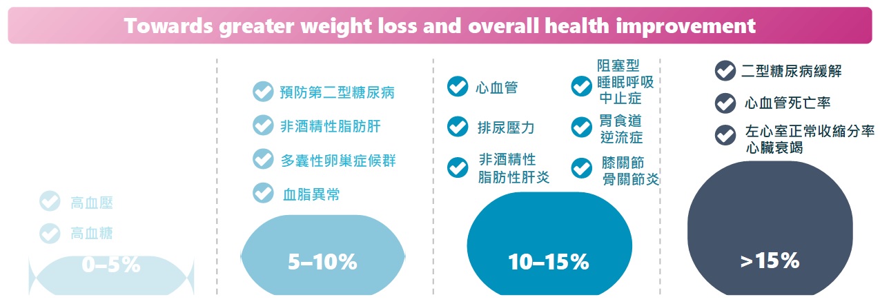 1.做為低熱量飲食及增加體能活動之輔助療法,適用對象為成人且初始身體質量指數 (BMI) 為≥30 kg/m2 (肥胖),或≥27 kg/m2 至 <30 kg/m2 (過重) 且至少患有一項體重相關共病,例如血糖異常 (糖尿病前期或第二型糖尿病)、⾼血壓、血脂異常、阻塞性睡眠呼吸中止或心血管疾病。