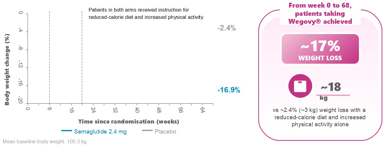 STEP 1 co-primary endpoint: Mean change in body weight (%) from week 0 to week 68