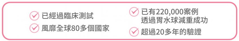將水球藉由胃鏡置入胃中,再將生理食鹽水注入水球內,藉由水球填充胃部產生飽足感, #以降低食物攝取量的方式達到減重效果。